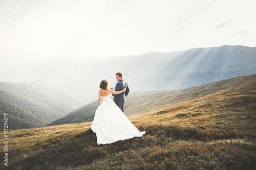 Happy wedding couple posing over beautiful landscape in the mountains