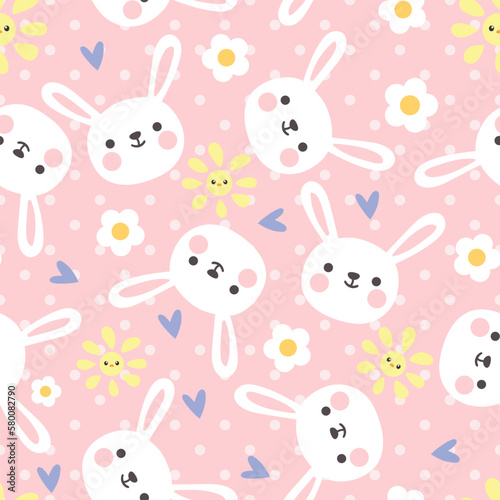 Happy white bunny with sun, flowers and hearts on a cute pink polka dot background. Kids vector seamless pattern.