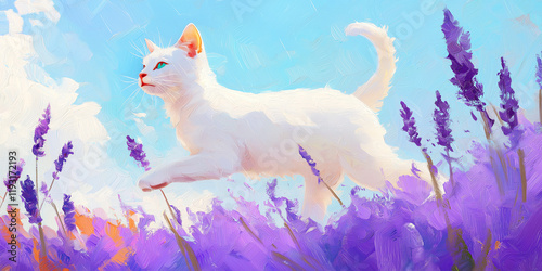 Happy white kitty walking in lavender field, beuatiful oil painting style