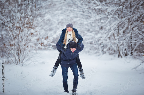 Happy winter travel couple. Man giving woman piggyback ride on winter vacation in snowy forest
