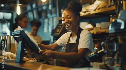 Happy woman barista and serving customer at cafe for service payment or order on counter at coffee shop African person waitress or employee in small business restaurant helping client : Generative AI