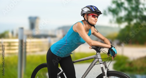 Happy woman dressed in cycling clothes, helmet and sunglasses riding a bicycle