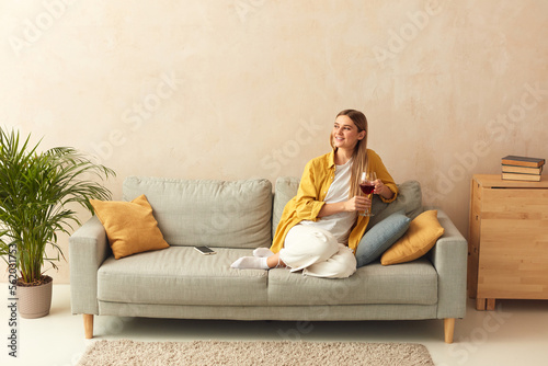 Happy Woman Drinking Wine At Home. Smiling Girl Relaxing On Sofa With Glass Of Red Wine At Home. Weekend Lifestyle Concept