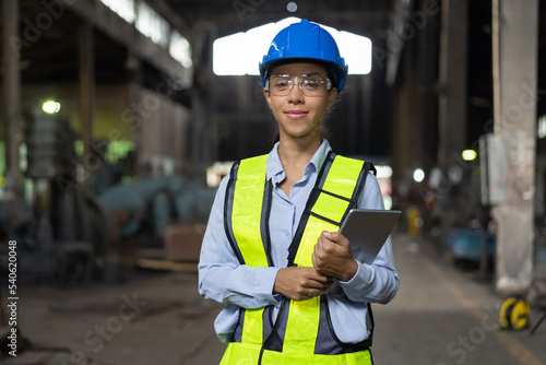 Happy woman engineer worker working with digital tablet at the industry factory area. Female technician wear safety helmet, glasses and uniform checking and working in the factory
