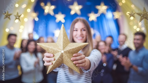 Happy Woman Holding a Golden Star in Front of a Crowd