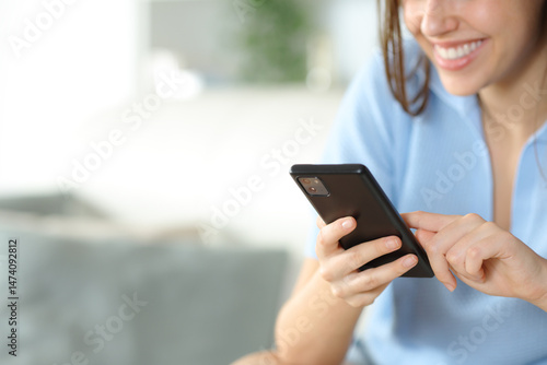 Happy woman holding and using smart phone at home