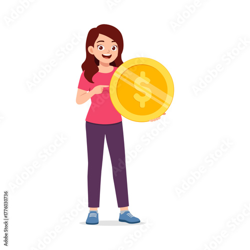 Happy Woman Holding Big Coin and Pointing Financial Saving Illustration Concept