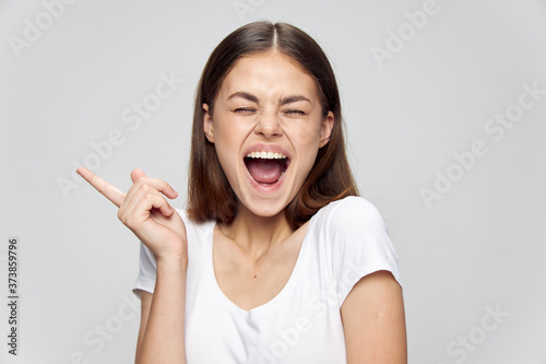 Happy woman in white t-shirt shows thumb to the side Copy Space laughing emotions