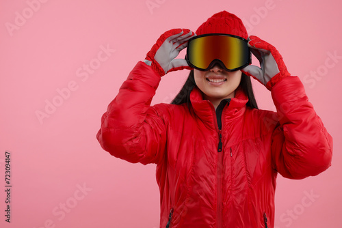 Happy woman in winter sportswear and goggles on pink background. Space for text