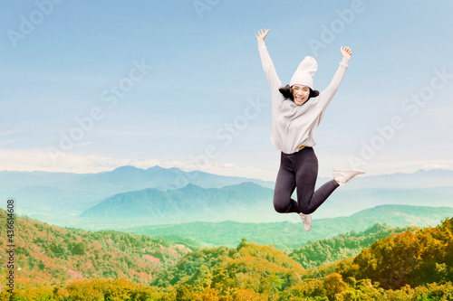 Happy woman jumping with misty mountain background