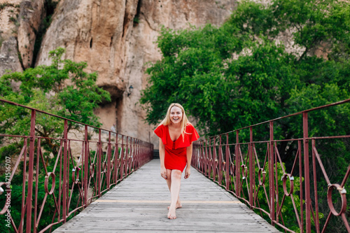 Happy woman on Saint Paul Bridge in Cuenca, Spain