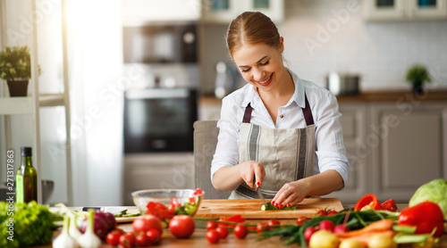 happy woman preparing vegetable salad in kitchen.