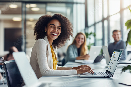 Happy Woman Smiling at Work in a Modern Office Setting