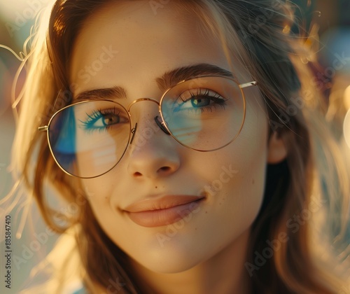Happy Woman Smiling in the Sunset Wearing Glasses - Close-Up Portrait Photograph