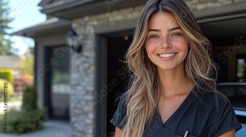 Happy Woman Smiling Outdoors with Green Eyes