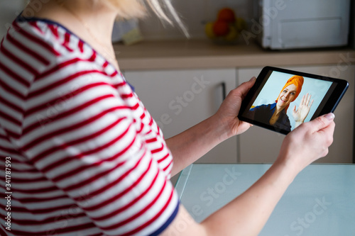 Happy woman using digital tablet for video call friends and parents, smiling girl sitting at home kitchen fun greeting online by computer webcam making videocall.
