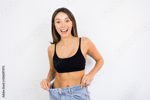 Happy Woman Weight Loss Wearing Old Pair of Jeans Too Big Thin Waist Slim Female Body