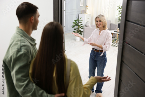 Happy woman welcoming friends to her apartment