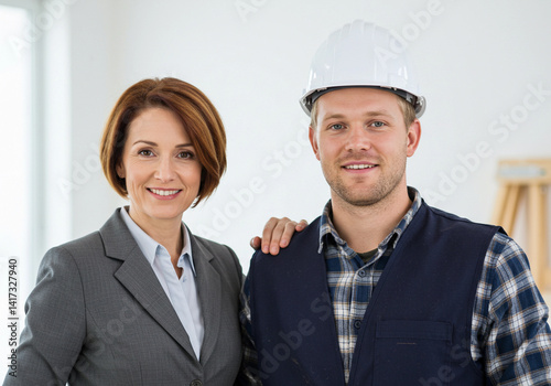 Happy woman with builder architect construction worker in hard hat. Successful project for office building, team work concept and construction industry