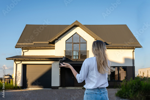 Happy woman with keys with new house background. Property lease real estate for relocation. Leasing insurance and purchase. Buying or renting