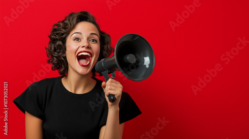 Happy Woman with Red Background Holding a Megaphone Announcing Discounts on Sale