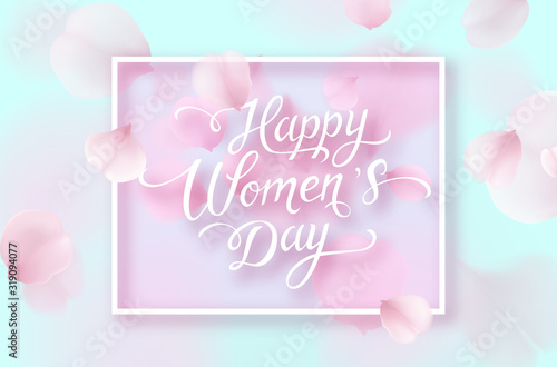 Happy Women 's Day greeting card with rose flower petals. Vector pink floral background. .