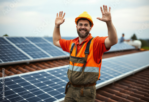 Happy worker stands confidently on a rooftop surrounded by solar panels, showcasing commitment to renewable energy and eco-friendly living.