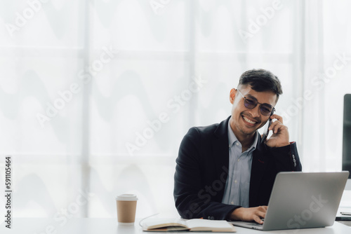 Happy working asian businessman talking on the phone with accounting documents at desk in happy working office