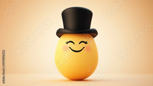 Happy yellow Easter egg wearing a top hat against a pale orange background.