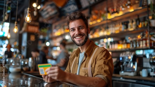Happy young adult man paying the bill with a contactless credit card on a restaurant bar or coffee shop Handsome male smiling holding a creditcard and giving a payment transaction to t : Generative AI