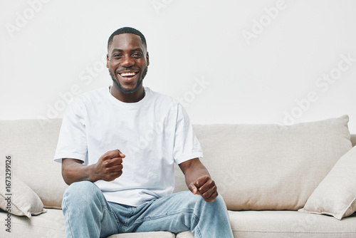 Happy young African American man smiling joyfully while sitting on a light colored couch, representing positivity and confidence in a modern living space