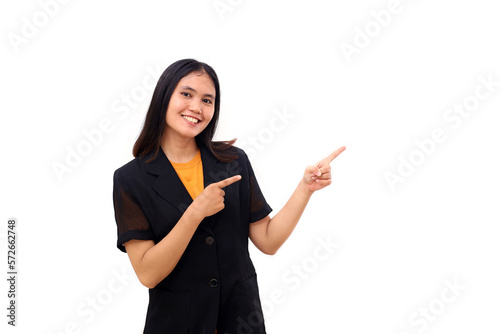 Happy young asian business woman standing while pointing at blank space beside her. Isolated