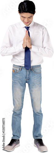 Happy young asian businessman to pay respect with hands, symbol of Thailand, happiness man with confidence, one person, business concept.