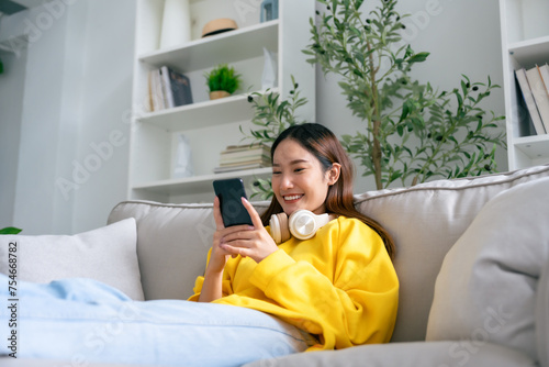 Happy young asian woman wearing headset and relaxing on comfortable couch at home, texting messaging on smartphone, smiling girl use cellphone chatting, online shopping at home, video call