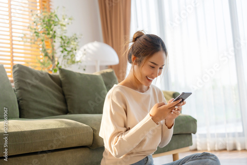 Happy young asian woman relax on comfortable couch at home texting messaging on smartphone, smiling girl use cellphone, chatting online message, shopping online from home