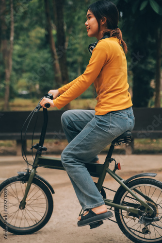 Happy young Asian woman while riding a bicycle in a city park. She smiled using the bicycle of transportation. Environmentally friendly concept.