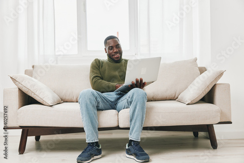 Happy young Black man using laptop on a cozy sofa in a bright, modern living room, showcasing a relaxed and productive atmosphere during home office hours