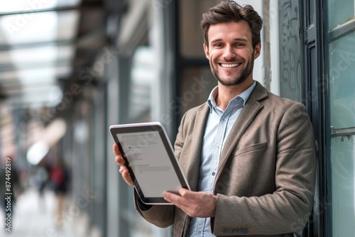 Happy young business man with tablet at work in modern urban background, Generative AI