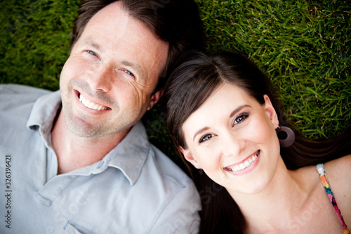 Happy Young Couple Lying in Grass Together Outside