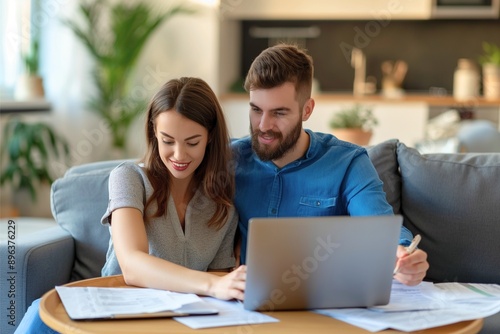 "Happy young couple planning finances together at home, looking at laptop screen and discussing documents."