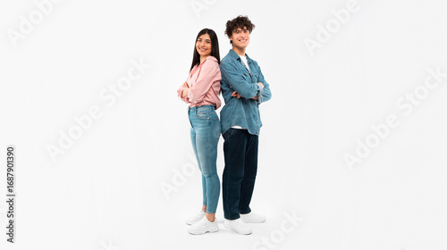 Happy Young Couple Posing Standing Back To Back Smiling To Camera Over White Background. Full Length Shot Of Boyfriend And Girlfriend Expressing Positive Emotions. Youth And Friendship. Panorama