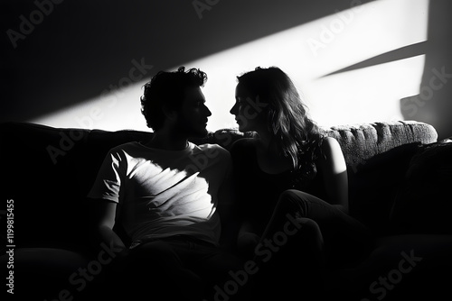 Happy young couple relaxing on a sofa, woman and man sitting on a cozy couch