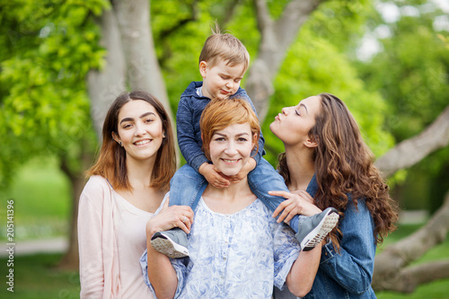 Happy young family enjoying free time in the park, mother, sisters and brother