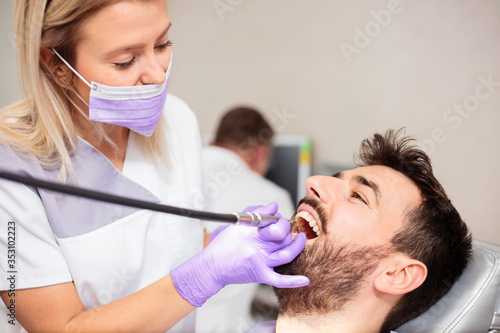 Happy young female Caucasian dentist drilling out dental cavity and preparing the tooth for filling. Young man having his teeth checked in a dental clinic