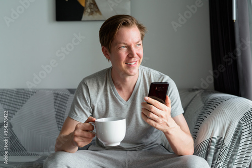 Happy young handsome man holding coffee cup and phone while thinking at home