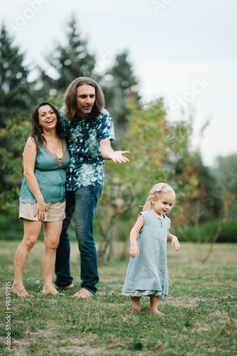 Happy young hipster family hug each other and looking at their child in park on summer sunset