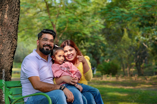 Happy Young indian parents with their cute little daughter sitting at park or garden.