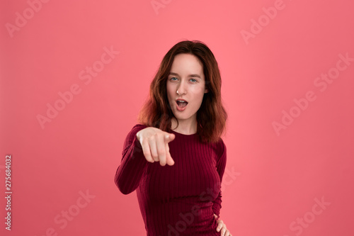 Happy young lady standing isolated over dark pink background looks at the camera while pointing at you expressing emotion of surprise