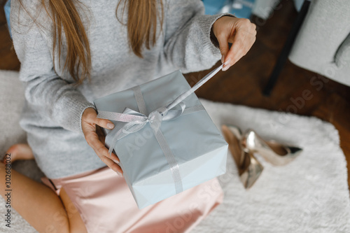Happy young lady with gifts near the Christmas tree. New year concept.