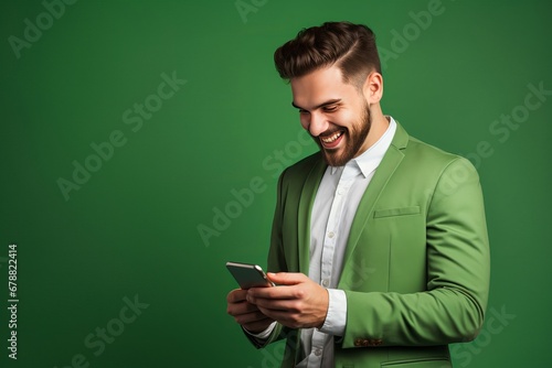 Happy young man smilling and texting on mobile phone